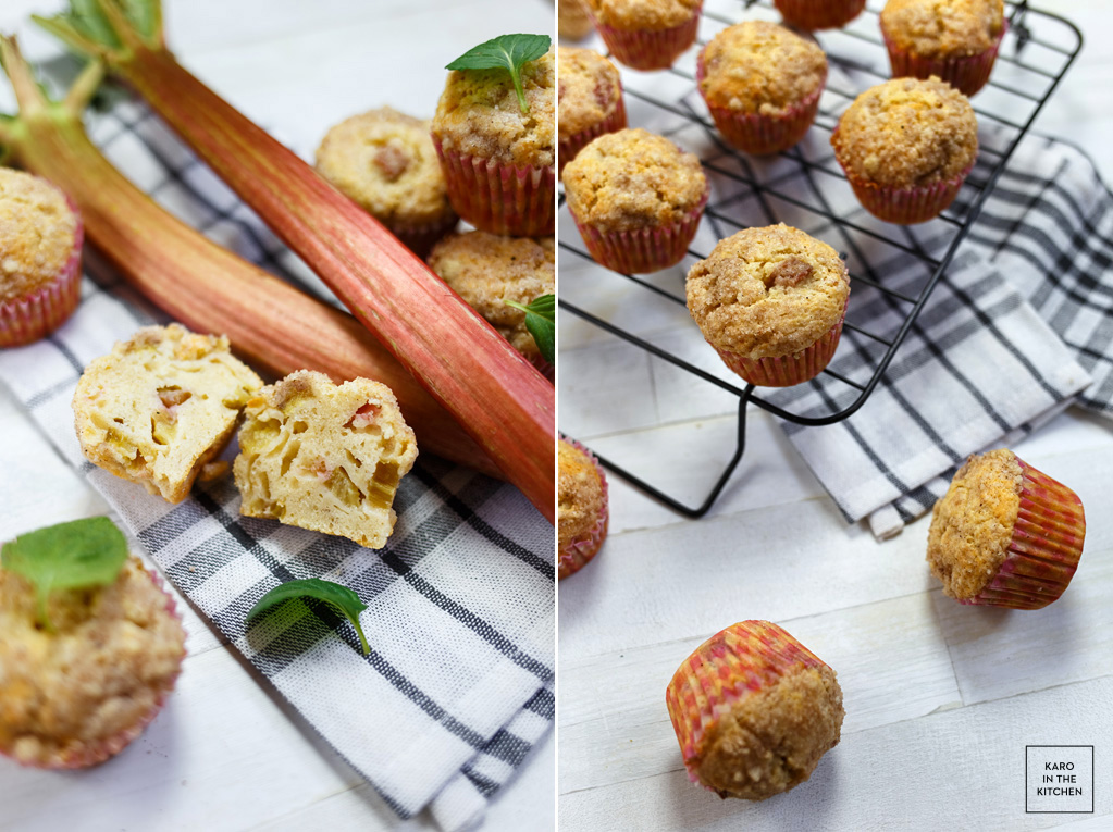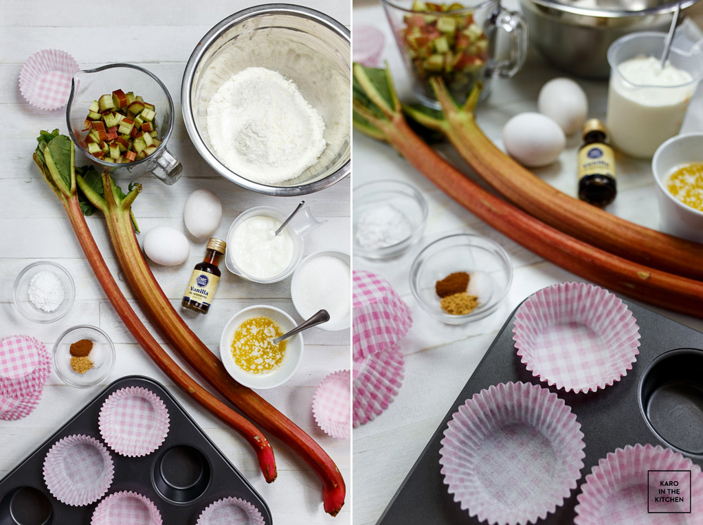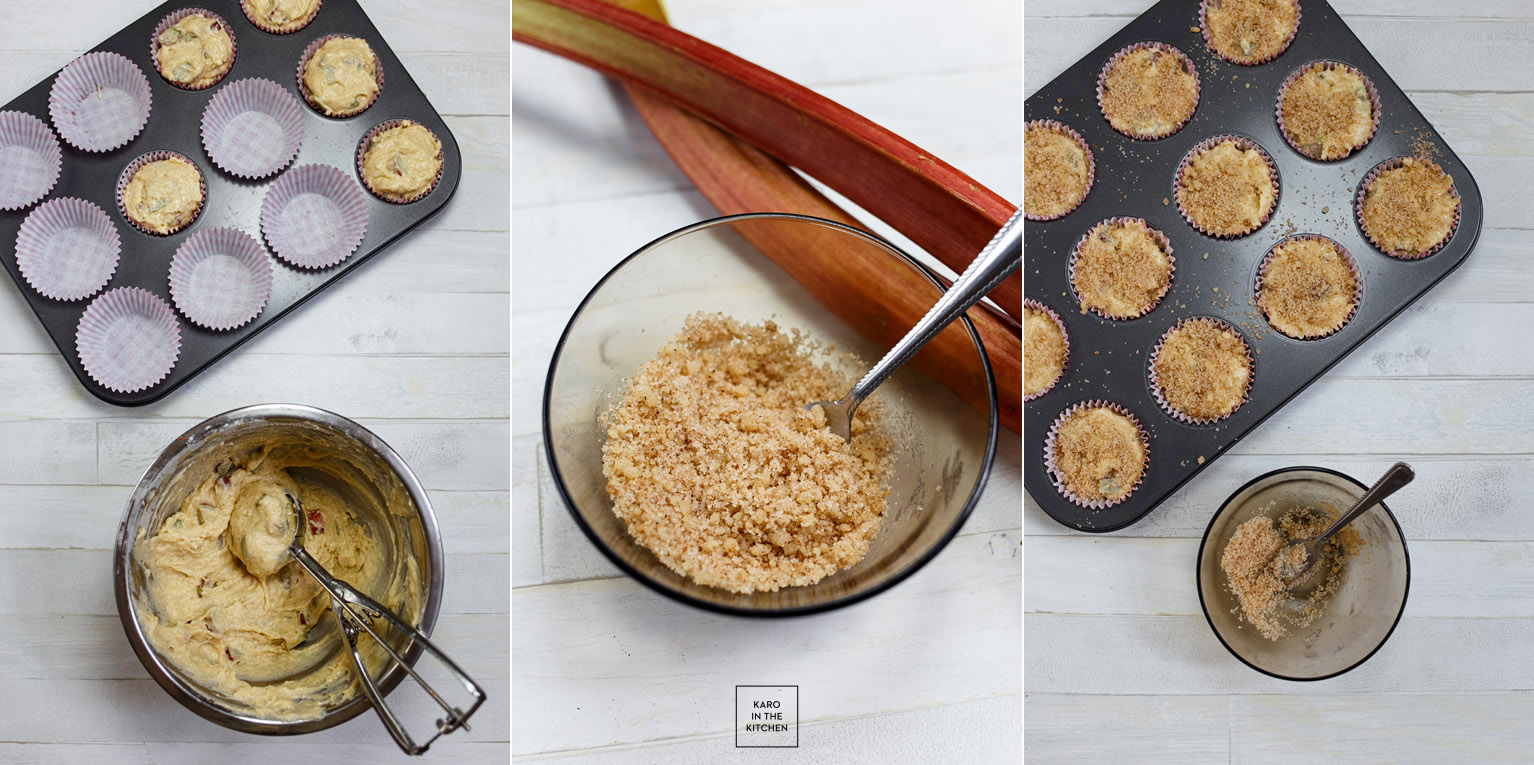 Do ‘suchej miseczki’ przesiewamy mąkę z proszkiem do pieczenia, wsypujemy cukier, sól, cynamon i imbir. Wlewamy mokre składniki do suchych i mieszamy do połączenia – nie za długo, tylko do czasu jak już na dnie miski nie będzie suchej mąki. Wsypujemy pokrojony rabarbar i jeszcze raz mieszamy.