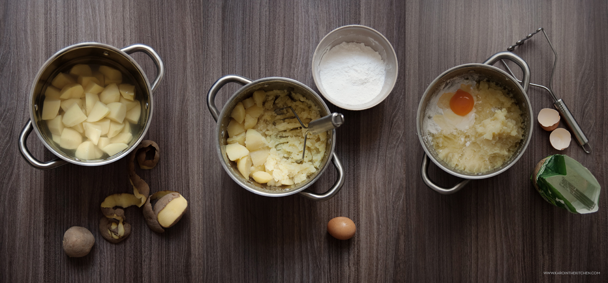 W garnku w którym się gotowały albo w osobnym naczyniu wszystkie utłuczone kartofle dłonią spłaszczamy i wygładzamy. Kiedy trochę ostygną, dzielimy masę na 4 równe części, jedną część wyjmujemy z naczynia i w to miejsce dodajemy dokładnie taką samą część mąki ziemniaczanej. Dodajemy wyjętą wcześniej część ziemniaków, jedno jajko i szybko mieszamy (widelcem, łyżką, ubijaczką do ziemniaków).