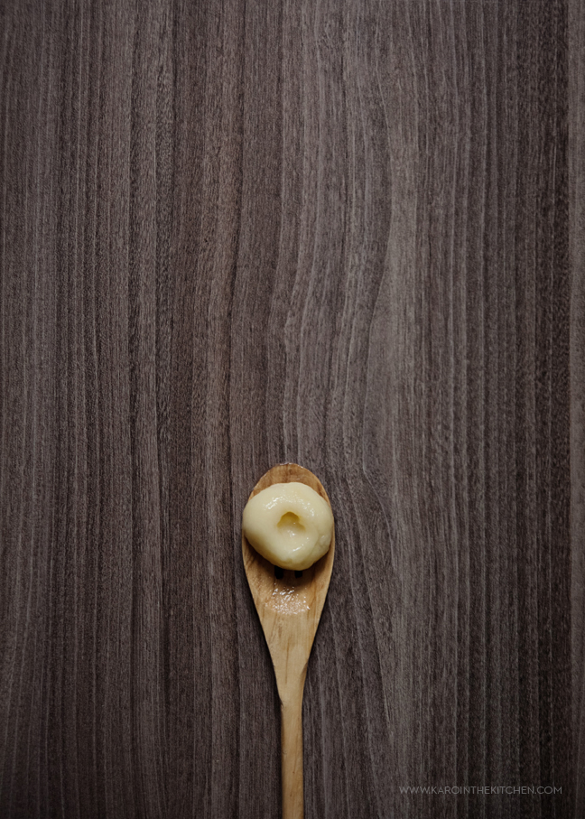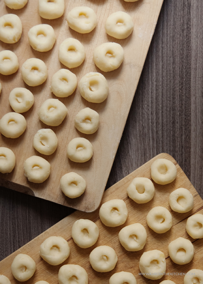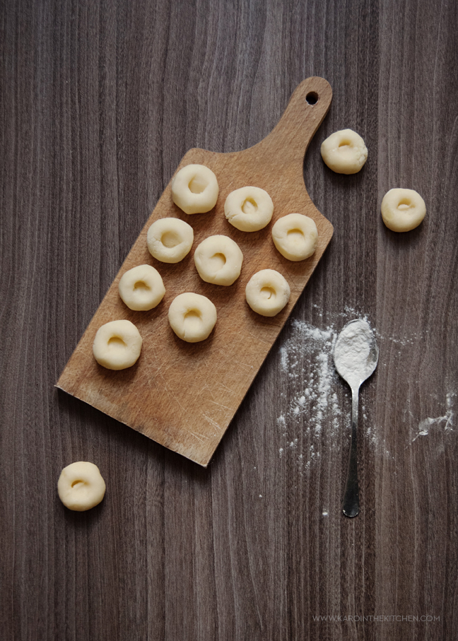 Ciasto ziemniaczane, czy na nasze śląskie gumiklyjzy, czy na klasyczne kopytka, czy na włoskie gnocchi nie lubi jak się je długo gniecie, masuje i dotyka. Moje pierwsze kopytka przez takie pieszczoty zaraz po tym jak wylądowały w garnku z wrzątkiem, porozpadały się i zostały totalną papką. Zróbcie to w miarę szybko. Wyciągamy po porcji ziemniaczano-skrobiowo-jajecznej mieszanki i na podsypanej mąką ziemniaczaną stolnicy toczymy obiema dłońmi dość grube wałki, wałki tniemy na kawałki wielkości orzecha włoskiego, turlamy w dłoniach zgrabne kulki, układamy na desce podsypanej mąką i palcem zanurzonym w mące robimy wgłębienia.
