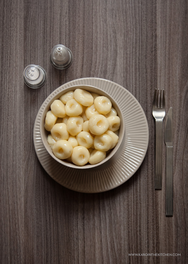 Wrzucamy partiami po 15 klusek na wrzącą osoloną wodę i gotujemy 2 minuty od wypłynięcia na powierzchnię. Odławiamy łyżką cedzakową. Żeby się nie sklejały po ugotowaniu wykładam je do plastikowego pojemnika z 2-3 łyżkami oleju, kilka razy poruszając obtaczam każdą kluskę w tłuszczu.