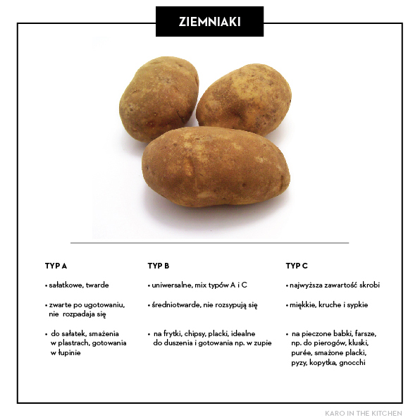 W Polsce oficjalnie jest zarejestrowanych około 100 odmian ziemniaków. Mimo wszystko ciężko się czasami zorientować, co kupujemy. Dawno nie spotkałam w warzywniaku podpisanych kartofli – trzeba dopytać sprzedawcy jakiego typu warzywo ma w swojej ofercie i do czego je poleca. Jeśli sam nie wie- poproście o przekrojenie ziemniaka i potrzyjcie o siebie obie połowy. Jeśli szybko wytworzy się biała, lśniąca i lepka piana- ziemniaki będą idealne na kluski, mają dużo skrobi. Jeśli zamiast piany zostanie sam płyn, a bulwy po przekrojeniu mają żółty lub ciemno beżowy miąższ z zarysowanym środkiem- nadadzą się raczej na sałatkę- dadzą się łatwo pokroić i nie będą się rozsypywać.