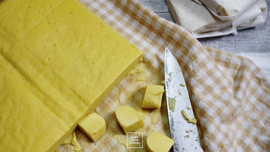 Po ostudzeniu i schłodzeniu na rano będzie gotowe coś, co konsystencją przypomina silken tofu – masę możecie pokroić, zapakować w silikonowany papier śniadaniowy i przechowywać w lodówce do tygodnia.