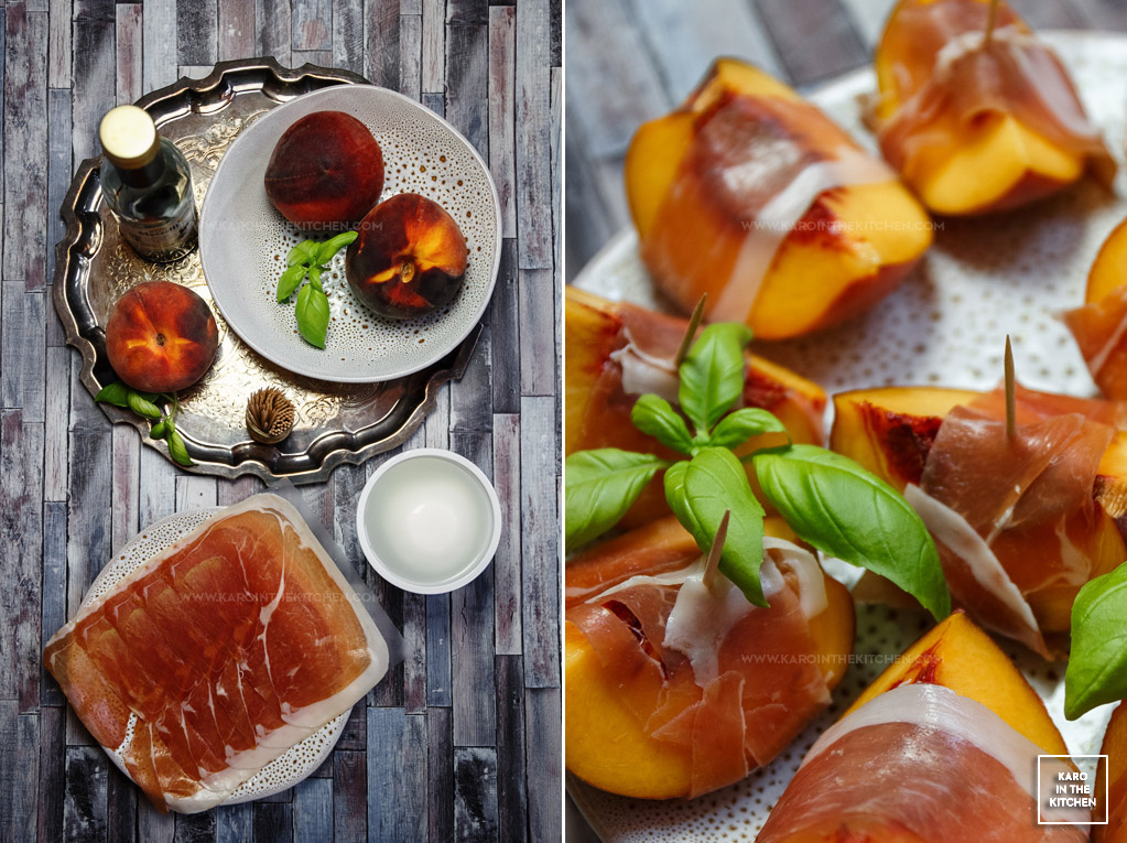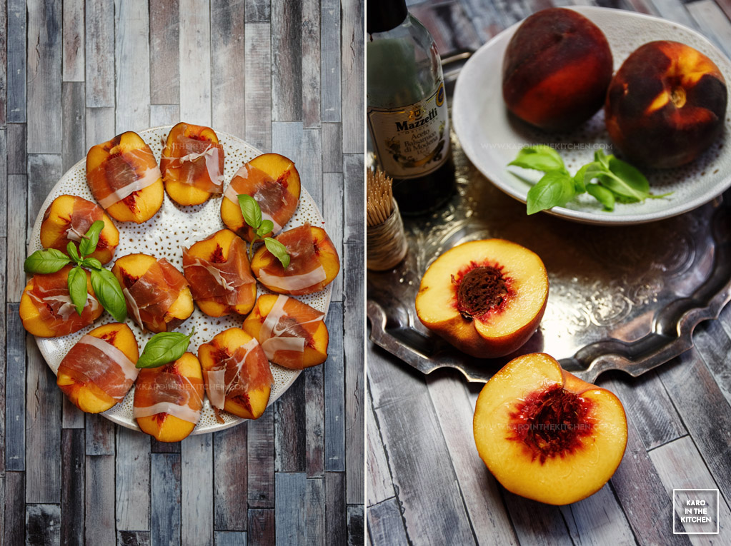 Brzoskwinie myjemy, osuszamy, kroimy na ćwiartki, wyrzucamy pestki. Szynkę parmeńską wyjmujemy z opakowania – dajcie jej się zagrzać, cienkie plasterki staną się bardziej plastyczne i nie będą się rwać. Plastry szynki dzielimy ostrym nożem wzdłuż na pół i zawijamy w nie brzoskwinie. Szynka parmeńska gdy dostanie trochę ciepła powinna sama się do brzoskwini przylepić – jeśli się nie lepi, albo plaster Wam się rozerwał, zepnijcie go przez środek brzoskwini wykałaczką.
