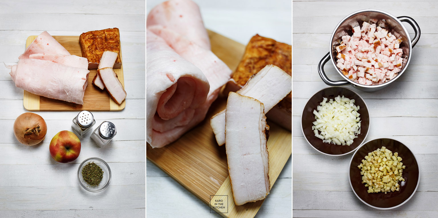 W taką samą drobną kosteczkę kroję słoninę wędzoną – to ona nadaje smalcowi specyficznego, bardzo głębokiego smaku. Ta słonina przez obróbkę cieplną (wędzenie) jest bardziej krucha od surowej, staje się prawie smarowna. Przed krojeniem dobrze zrobi jej też lekkie zmrożenie. Kroję ją w takiej samej wielkości kostkę jak wcześniej pokroiłam słoninę surową.