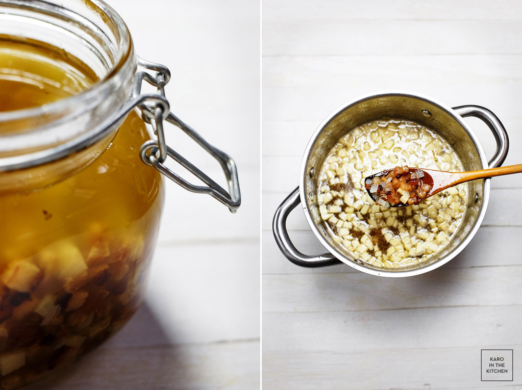 Mieszamy i wytapiamy dalej, co jakiś czas sprawdzając stopień wysmażenia skwarek – uważajcie na ręce, słonina będzie coraz mocniej się pienić! Gdy skwareczki zmniejszą już swoją objętość o jakieś 2/3, zaczną robić się złote – smażymy je w tłuszczu do momentu aż ich stopień przyrumienienia nam odpowiada. W tym momencie do garnka dodajemy pokrojoną cebulę i jabłko, dodajemy sól, majeranek i smażymy – stale mieszając –wszystko razem do czasu, aż cebula i jabłko się zeszklą.