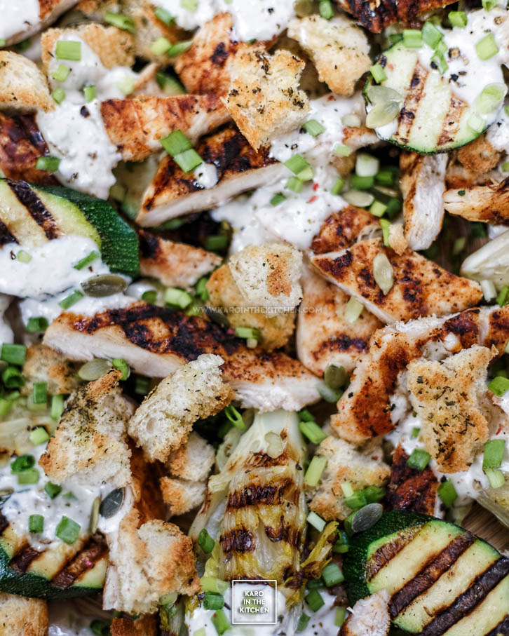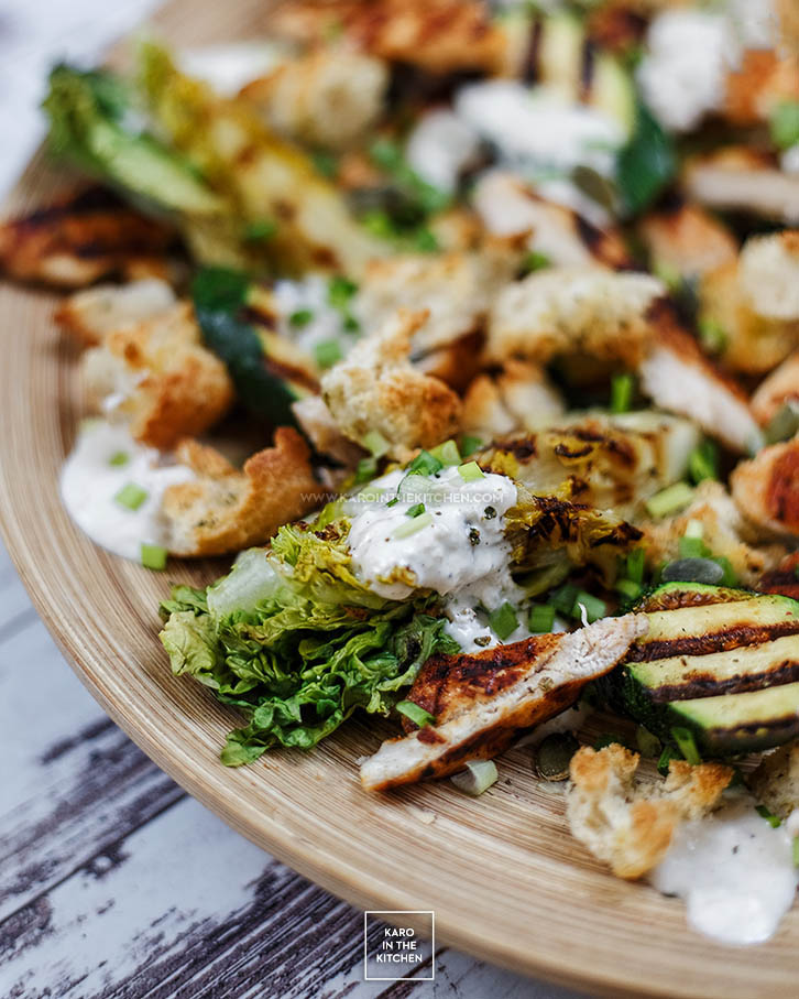 Budowanie naprawdę smacznej sałatki wcale nie jest trudne. Staram się zawsze zderzyć ze sobą coś słodkiego z czymś kwaśnym, a coś wytrawnego z czymś lekkim i świeżym. Wyraźny smak jednego ze składników wyrównywać i utemperować smakiem delikatnym. Do czegoś twardego dodać coś miękkiego. Sałatka to kontrast – tutaj lekko chrupkie, grillowane zielone warzywa dostają za towarzystwo grillowaną pierś z kurczaka, ziołowo-czosnkowe grzanki i dressing cebulowy, który wszystko świetnie ze sobą spaja. Ta sałatka z grillowanym kurczakiem świetnie sprawdzi się i na ciepło, i na zimno – jako cały obiad, danie do zabrania na piknik albo do lunchboxa do pracy.