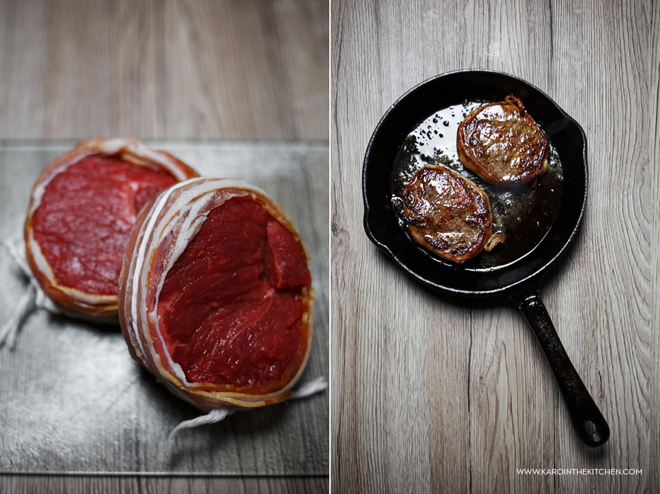 Dwa małe steki wykroiłam z jednego kawałka steku z rostbefu – wycinamy je tak, by łatwo dały się uformować w równe i okrągłe imitacje steków z polędwicy. Krawędzie każdego ze steków zawijamy w cieniutkie plastry surowego wędzonego boczku – użyłam po dwa plastry na jeden stek. Obwiązujemy steki ciasno bawełnianą grubą nicią, żeby boczek podczas smażenia nie odpadł, a steki zachowały swój kształt . Mięso leciutko smarujemy oliwą i pieprzymy.